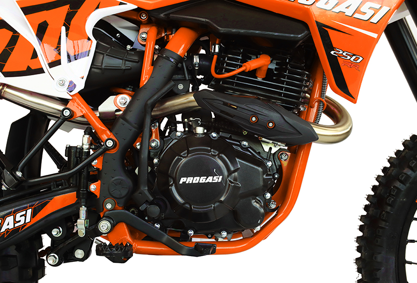 PROGASI Super Max 250 RR построен на прочной хромомолибденовой раме, усиленной дополнительными элементами для экстремальных нагрузок. Каждая точка сварки выполнена с ювелирной точностью, а пластиковый каркас надёжно защищает раму и ваши мотоботы от повреждений. Этот мотоцикл готов выдержать всё, что вы ему предложите.